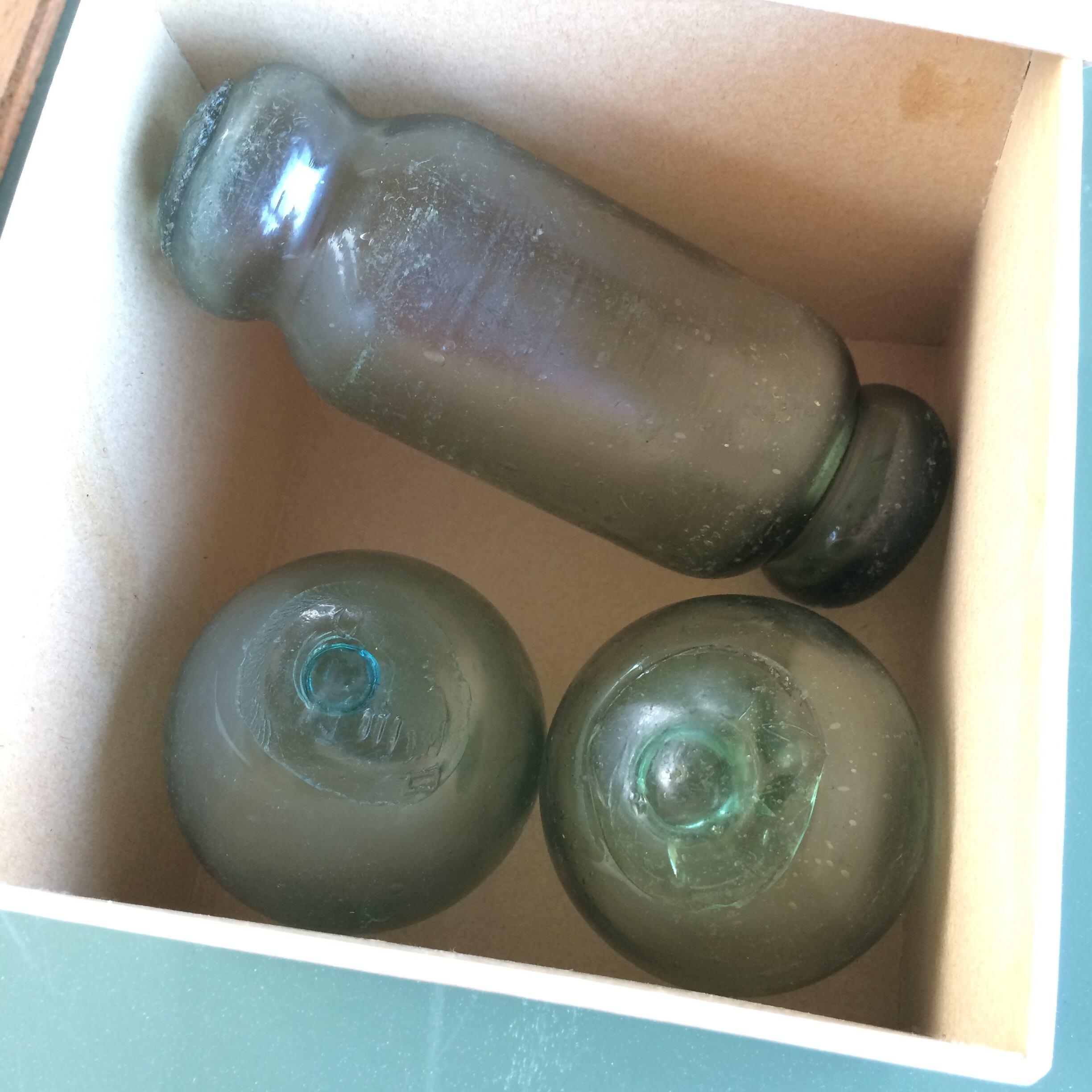 貴重なガラス浮きの中でもレアな刻印入りとシリンダー型を含む3点セットです。